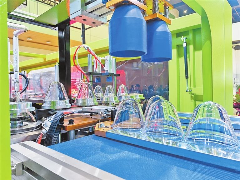 技术加持,塑料制造向智能化和自动化迈进。展会现场,一条全自动化的广口瓶生产线引发围观,生产工人只需添加原料,经过一道道复杂的程序工艺,一个个透明立体的广口瓶便沿着生产线匀速输出。“这台广口吹瓶机采用微电脑控制系统,极大解放了人力,操作起来简单便捷,生产工艺流程实现了全自动化。”现场工作人员介绍,这种机器适用于吹制以PET/PC/PP/PE为原料的碳酸饮料瓶、矿泉水瓶、农药瓶、化妆品瓶、医药瓶等各种形状的塑料容器。